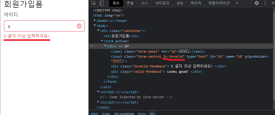 5글자 이상입력하라는 경고 메세지가 작성될때 is-invalid가 추가 되었다.
