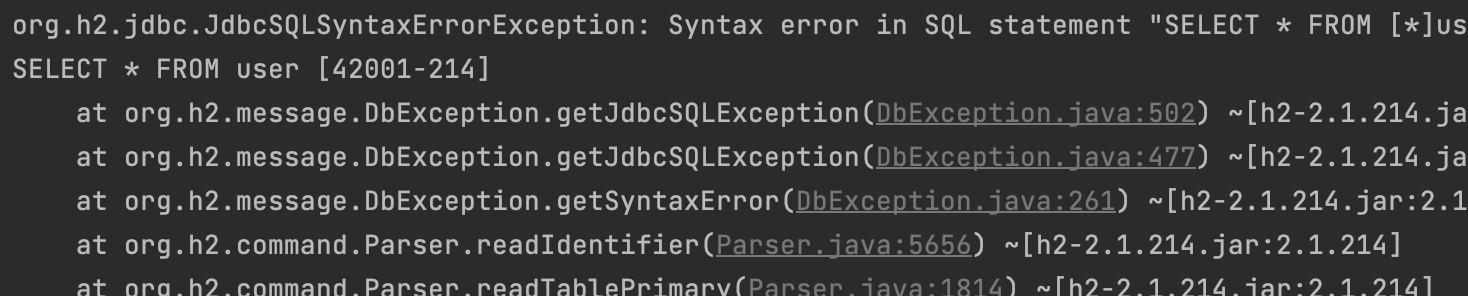 org.h2.jdbc.JdbcSQLSyntaxErrorException Exception이 발생됬다.