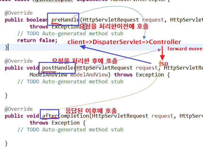 preHandle 메소드 👉 컨트롤러의 실행 전에 호출되며, 요청의 처리 전에 수행할 작업을 구현한다. boolean값을 반환하며, false를 반환하면 요청을 처리하지 않고 중단할 수 있다.