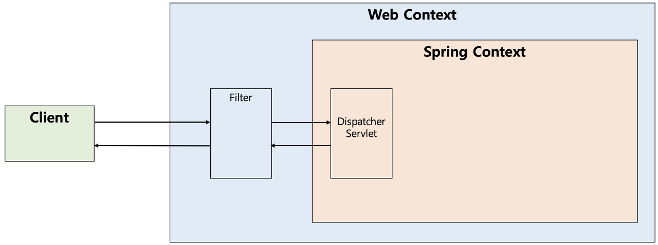 필터는 Servlet 스펙에 정의된 기능으로, 웹 애플리케이션의 모든 요청과 응답에 대해 작동한다. 따라서 스프링과는 독립적으로 동작하며, 웹 서버와 서블릿 컨테이너 사이에 동작한다. - 작동 순서