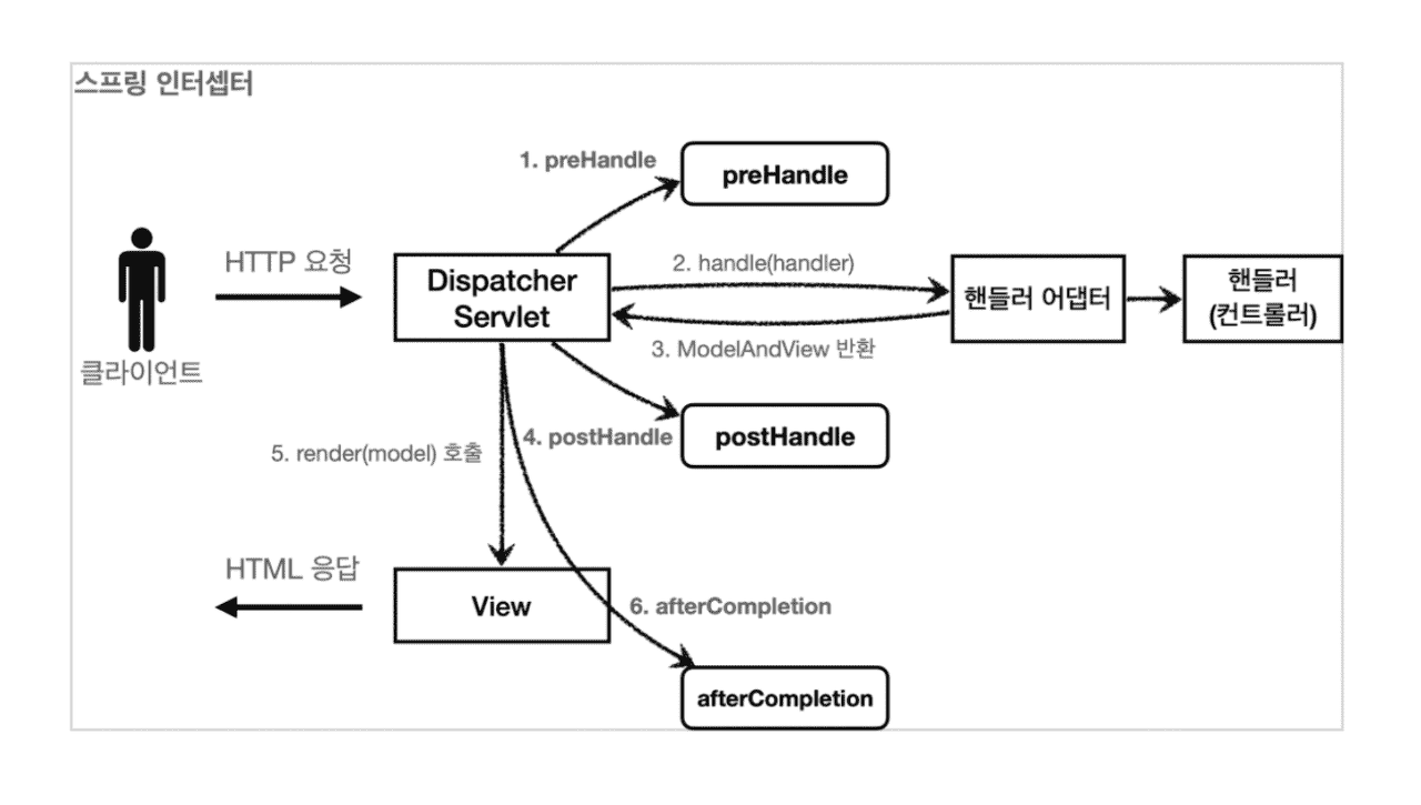 afterCompletion 메소드 👉 뷰의 렌더링까지 완료된 후에 호출되며, 요청의 처리가 완전히 끝난 후에 수행할 작업을 구현한다. - 구현한 Interceptor를 등록