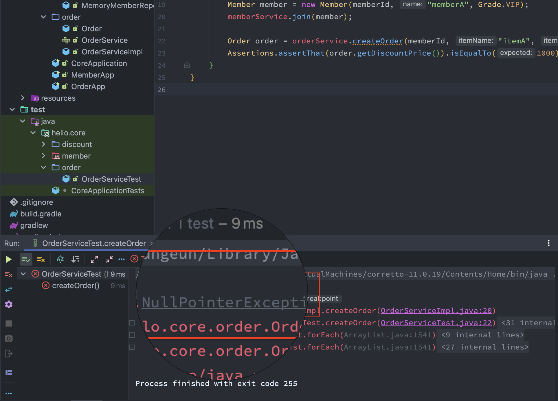 하지만 인터페이스만 덩그러니 있게 된 상태에서 Test를 진행한다면 당연히 NullPointerException이 발생한다.