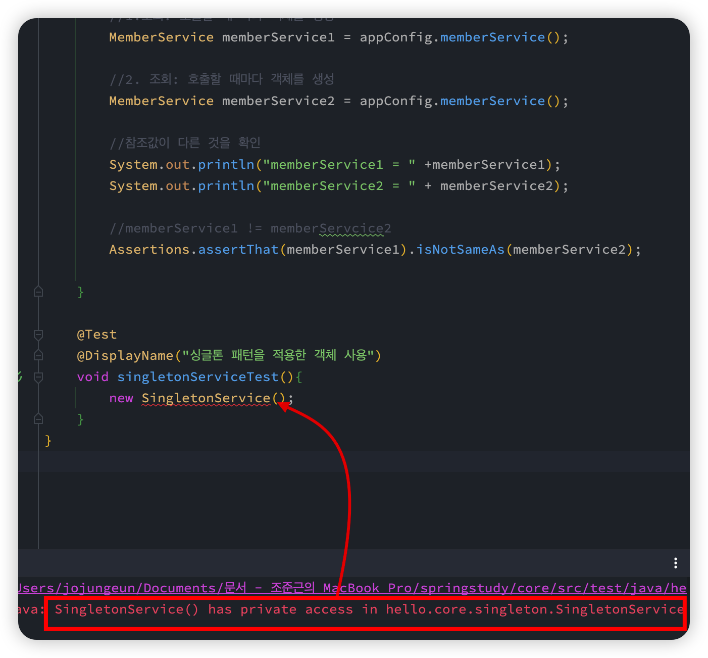 싱글톤으로 만들었기에 new를 이용해 호출하는 것 조차 안된다.