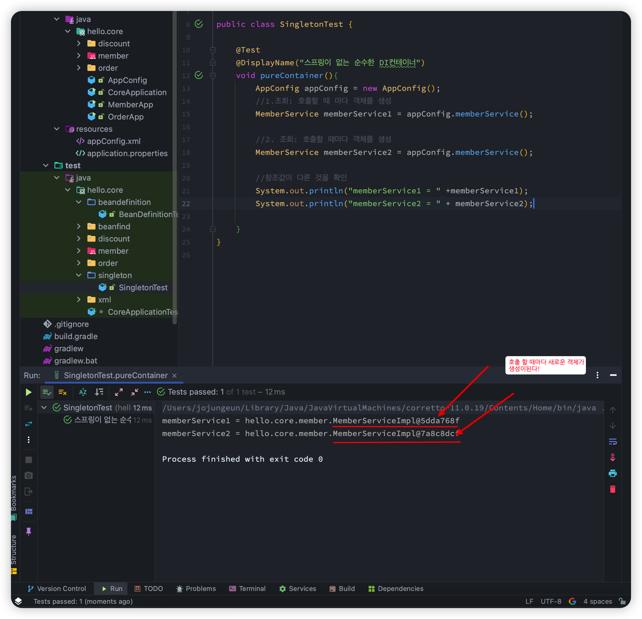 순수한 DI컨테이너인 AppConfig는 요청을 할 때마다 객체를 새로 생성한다.