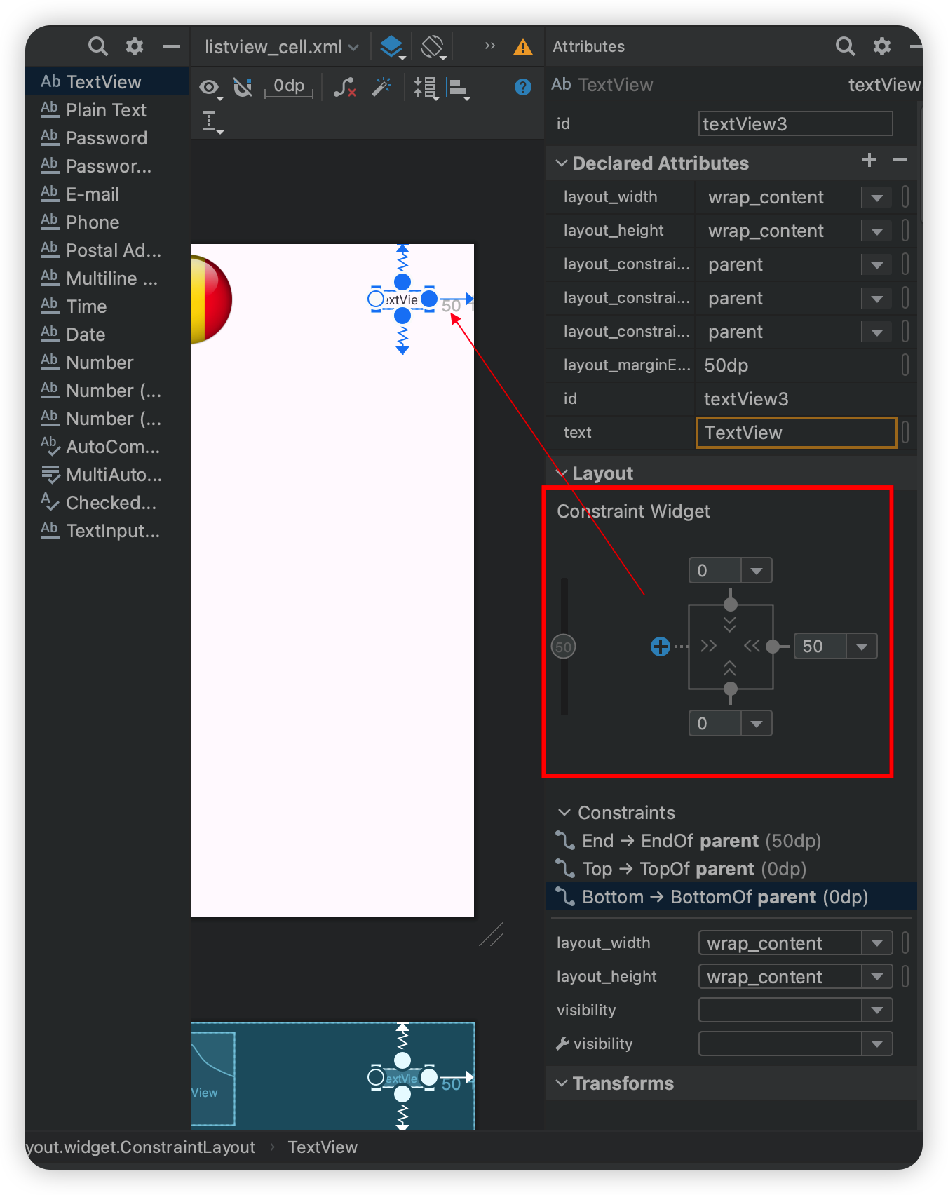 Textview는 오른쪽으로 부터 50dp