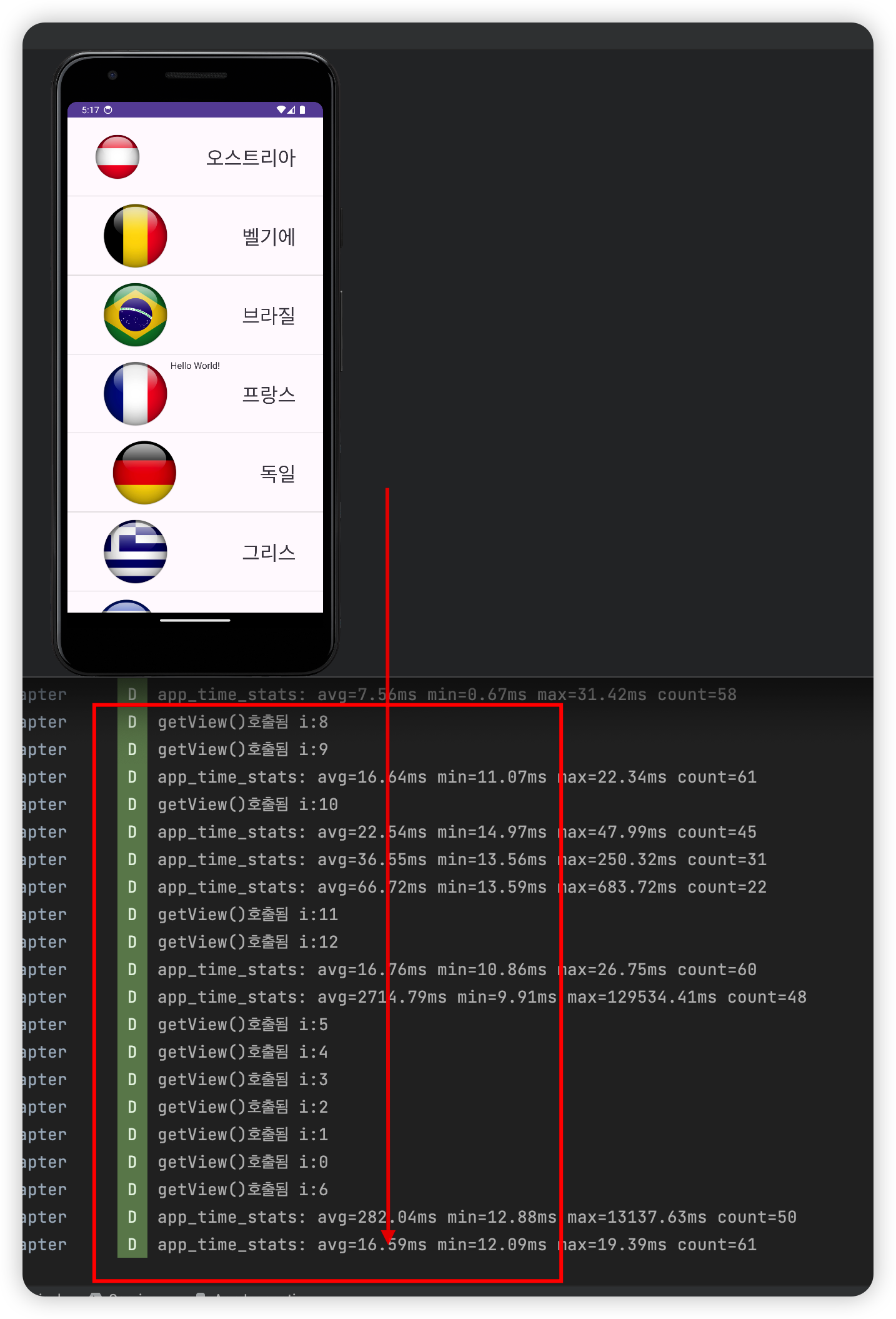 새로 객체를 생성하는지 확인하기 위해 Log를 활용해 보았다 다음사진은 처음 디바이스를 실행했을 때 몇개가 출력되는지 확인해보는 사진이다.