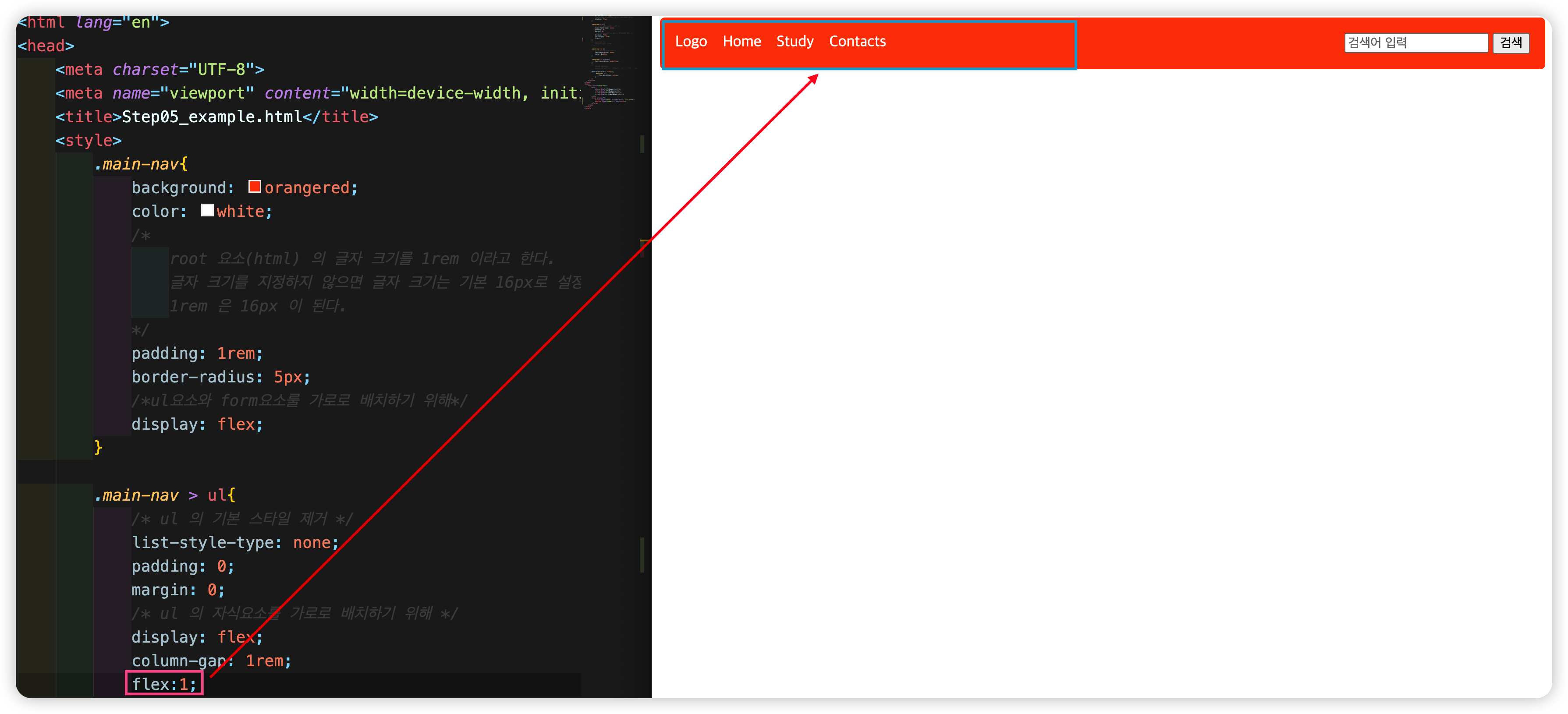 main-nav의 자식요소인 ul에 flex:1; 을 주어서 ul의 요소들이 남는 공간을 차지 할 수 있도록 했다.