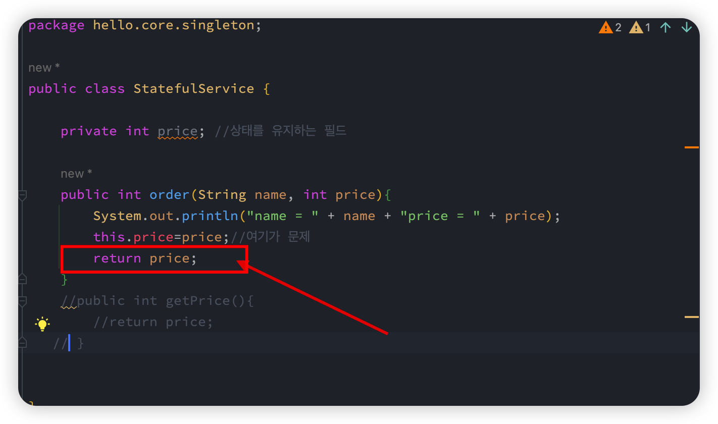 기본적으로 싱글톤이 멀티스레드 환경에서 서비스 형태의 오브젝트로 사용되는 경우에는 상태정보를 내부에 갖고 있지 않은 무상태(stateless)방식으로 만들어져야 한다, 다중 사용자의 요청을 한꺼번에 처리하는 스레드들이 동시에 싱글톤 오브젝트의 인스턴스 변수를 수정하는 것은 리스크가 매우 크다. 하나의 저장공간을 사용 하므로 서로의 값을 덮어쓰고 자신이 저장하지 않은 값을 읽어올 수가 있기 때문이다.