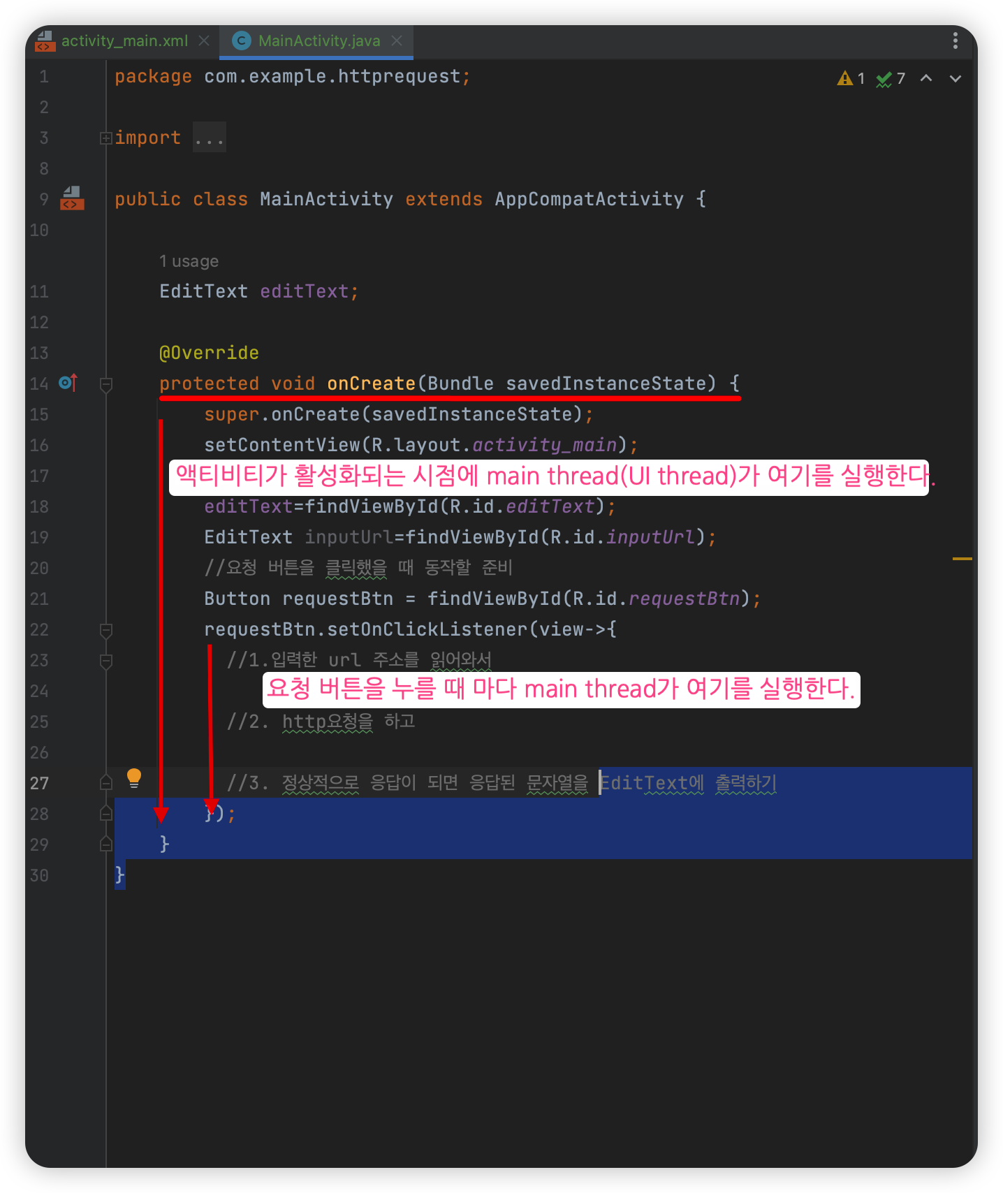 UI는 main thread에서만 사용하기 때문에 thread에 딜레이가 생기게되면 안된다. 딜레이가 발생하게 되면 안드로이드가 앱을 강제로 중지시켜버린다. 이럴 경우에는 sub thread를 만들어서 진행하게 되면 된다(2번 주석 부분).