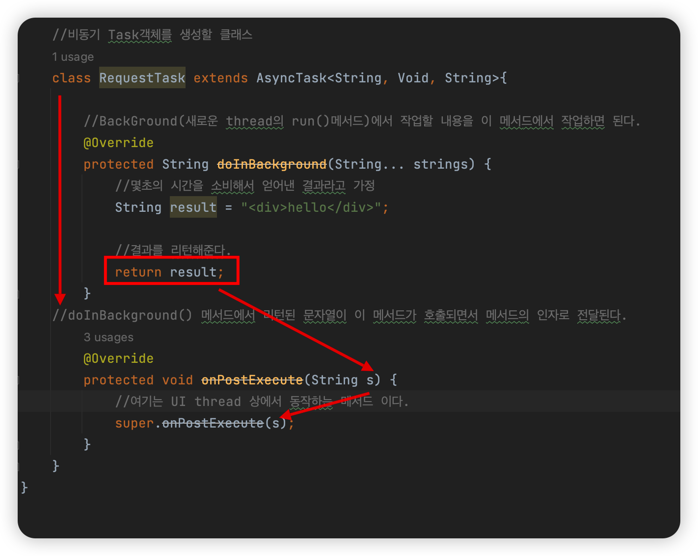 background thread에서 return 받은 값을 onPostExecute()메서드로 전달해주어 결과를 출력해준다.