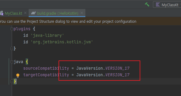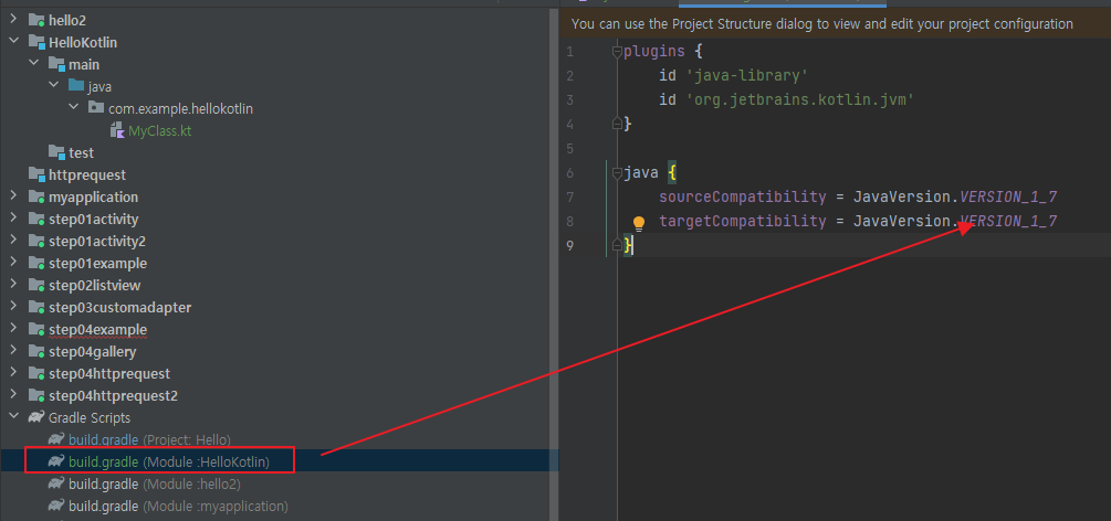 타겟이 1.7로 되어있는 부분을 build.gradle에서 해당하는 모듈을 찾아서 수정해준다.
