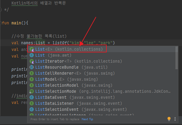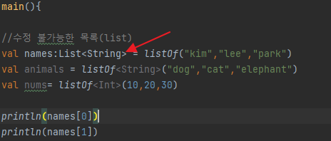 Kotlin에서 배열을 생성할 때에는 listOf()메서드를 사용해서 만든다.