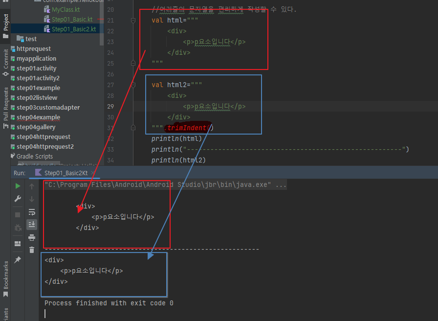 위에 캡쳐본에서 사용한 .trimIndent()는 쓸데없는 들여쓰기를 지워주는 역할을 해준다.