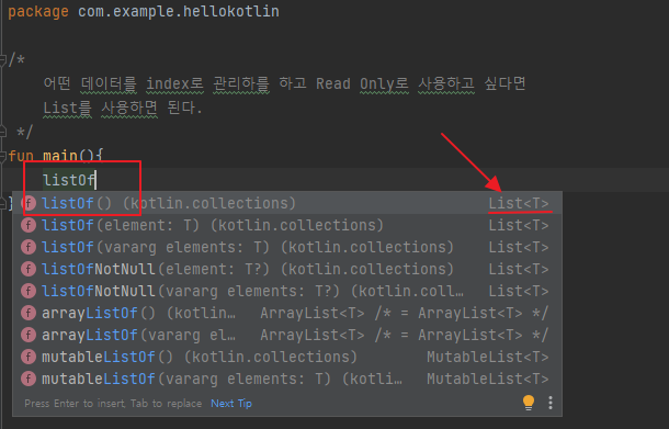여기서 또 listOf<String>뒤에 ("kim", "lee", "park")를 보고 String인 것을 보고 추론이 가능하므로 이도 생략이 가능하다.