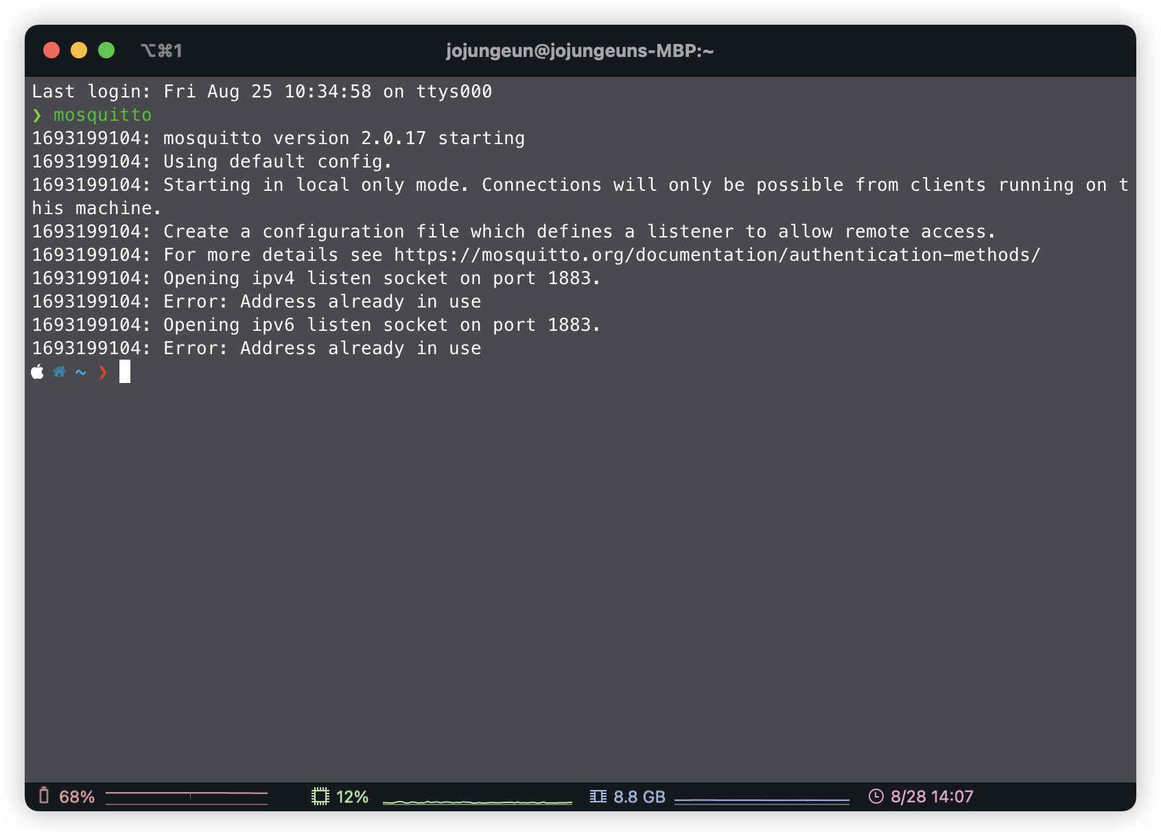 이미 사용중인데.. 그냥 Mosquitto서비스를 재시작해보겠다..