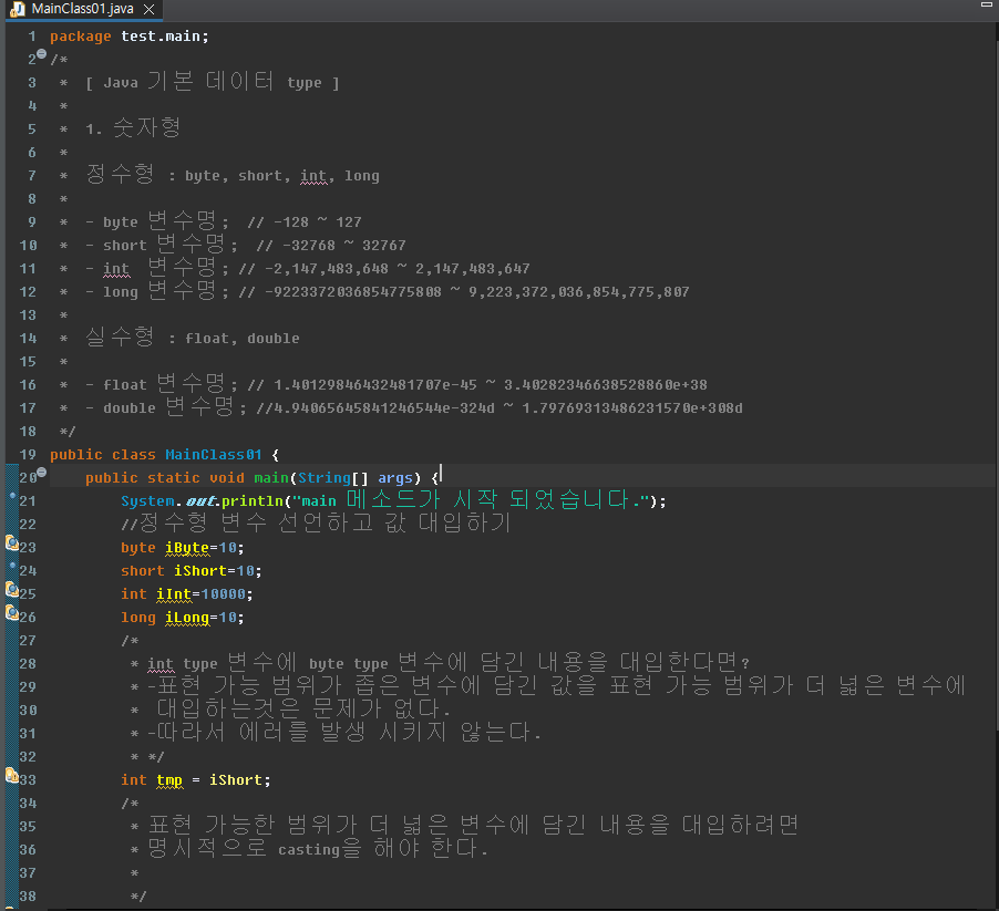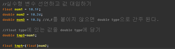 자바의 기본형 타입중 정수형 실수형 타입과 형변환에 대해 배우고있다.
