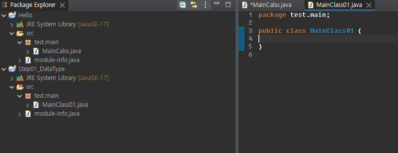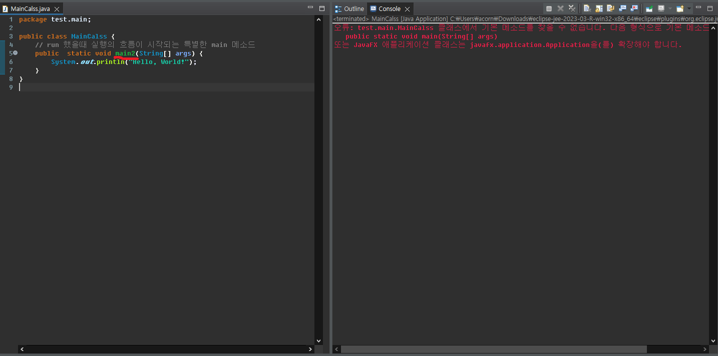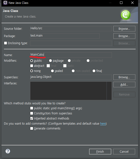 위처럼 만들어진 test.main에 새로운 Class를 만들어보았다. 클래스 이름은 MainClass(카멜케이스사용)으로 만들었다.