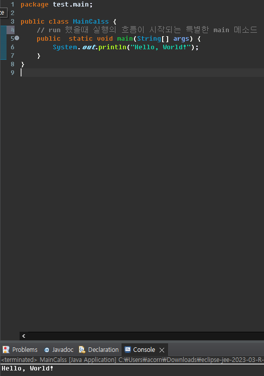 main method 는 run했을 때 실행의 흐름이 시작되는 특별한 main 메소드이다.