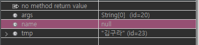 // 결과 값으로는 name에는 null이라는 값이부여, tmp라는 변수에는 "김구라"라는 데이터 값이 들어간다.