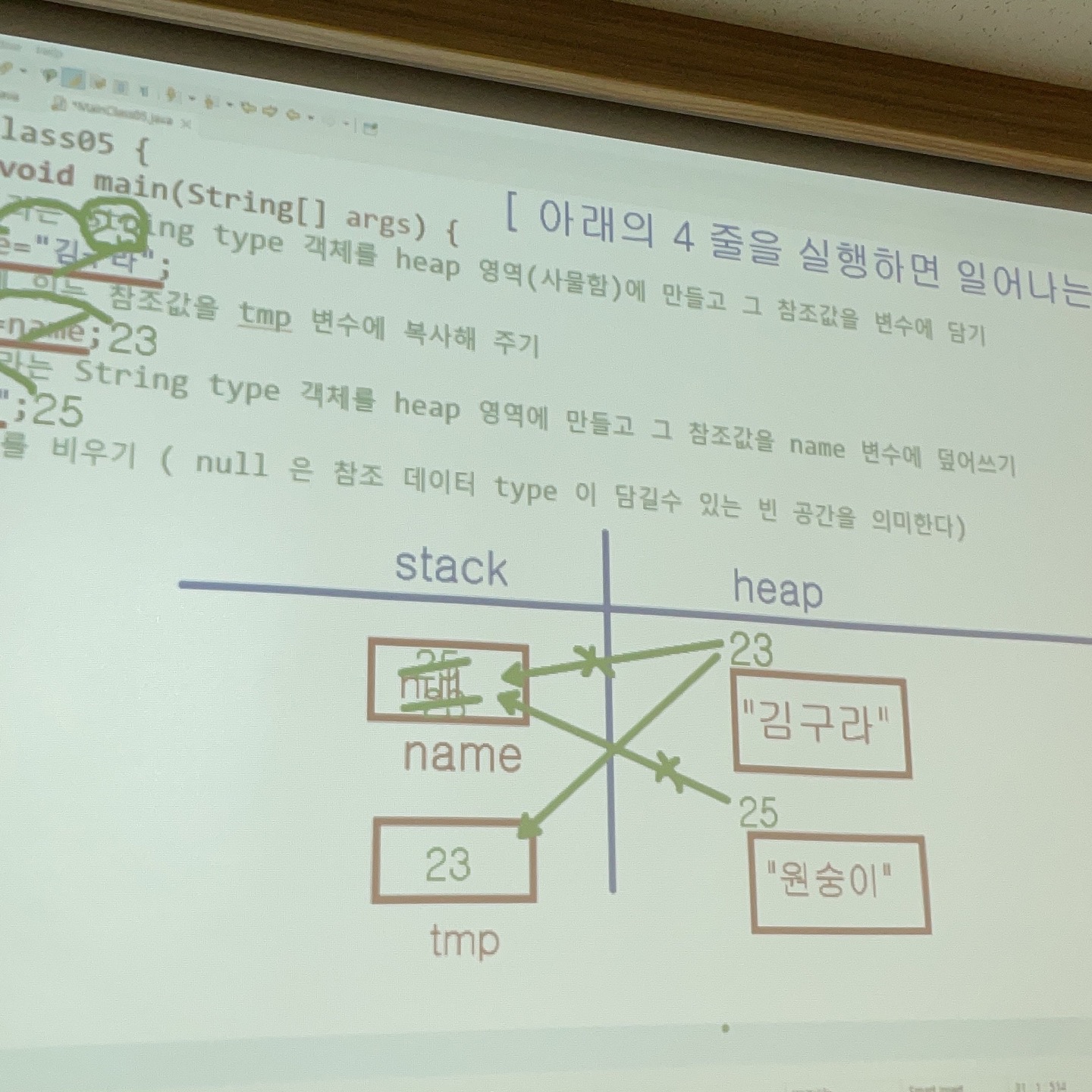 tmp라는 지역변수가 생기고 똑같은 값인 heap영역에 있는 "김구라"라는 값음 가짐 - name변수에 "김구라"데이터값을 "원숭이"라는 데이터 값으로 뒤집어 씌움
