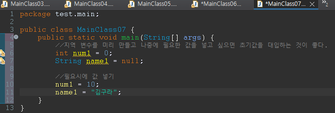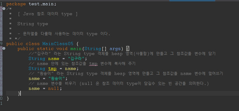 //"김구라" 라는 String type 객체를 heap 영역(사물함)에 만들고 그 참조값을 변수에 담기