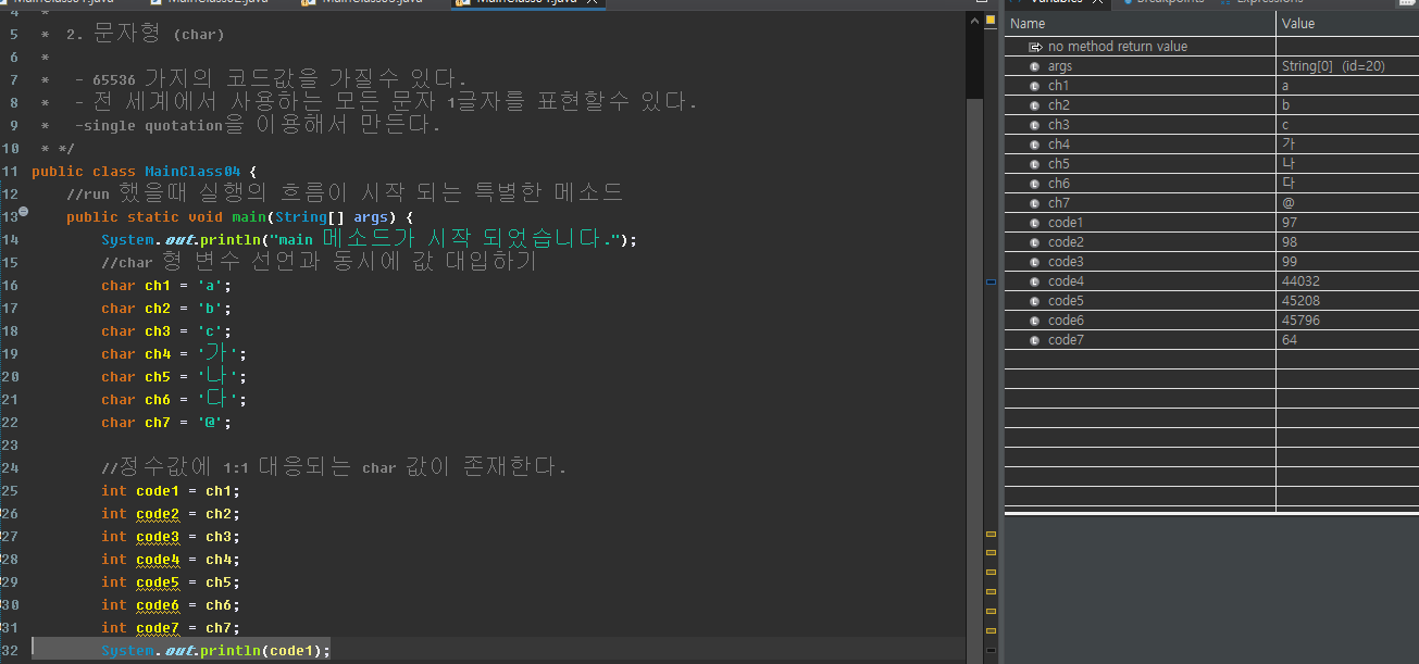 char 값을 int값을 형변환했을 경우 오른쪽 value값처럼 유니코드 값이 나타낸다.