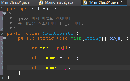 int[] 배열 타임은 참조형 데이터 타입이다. 그래서 저렇게 배열로 선언된 참조형데이터 타입에 0을 넣게 되면 오류가 발생한다.